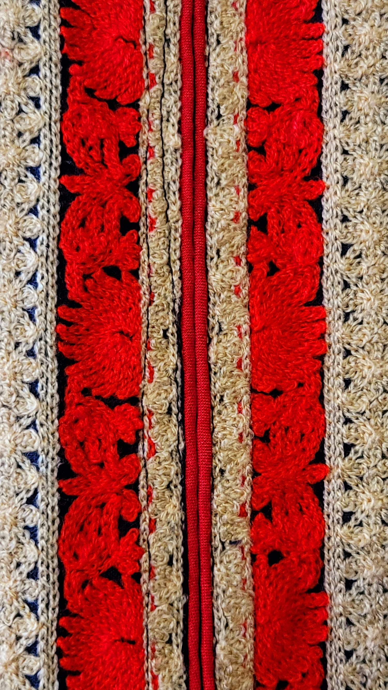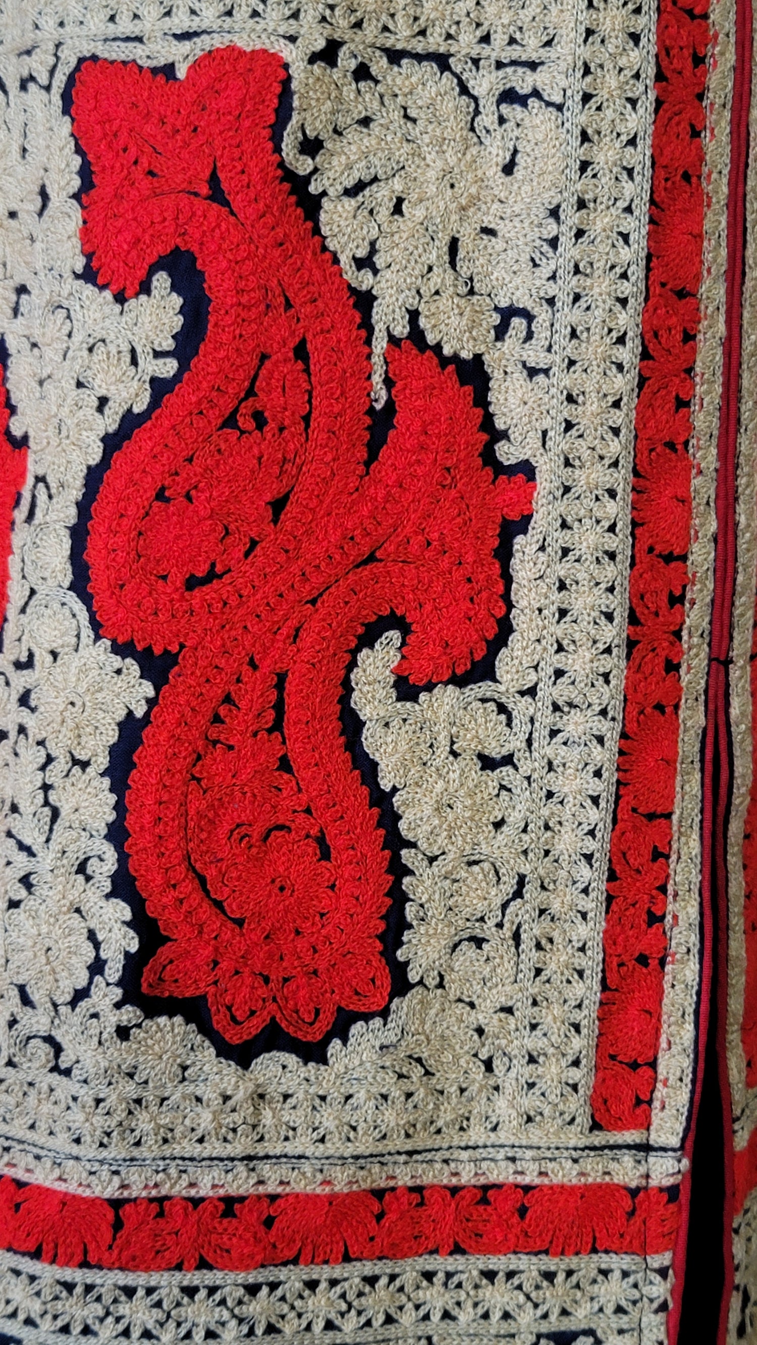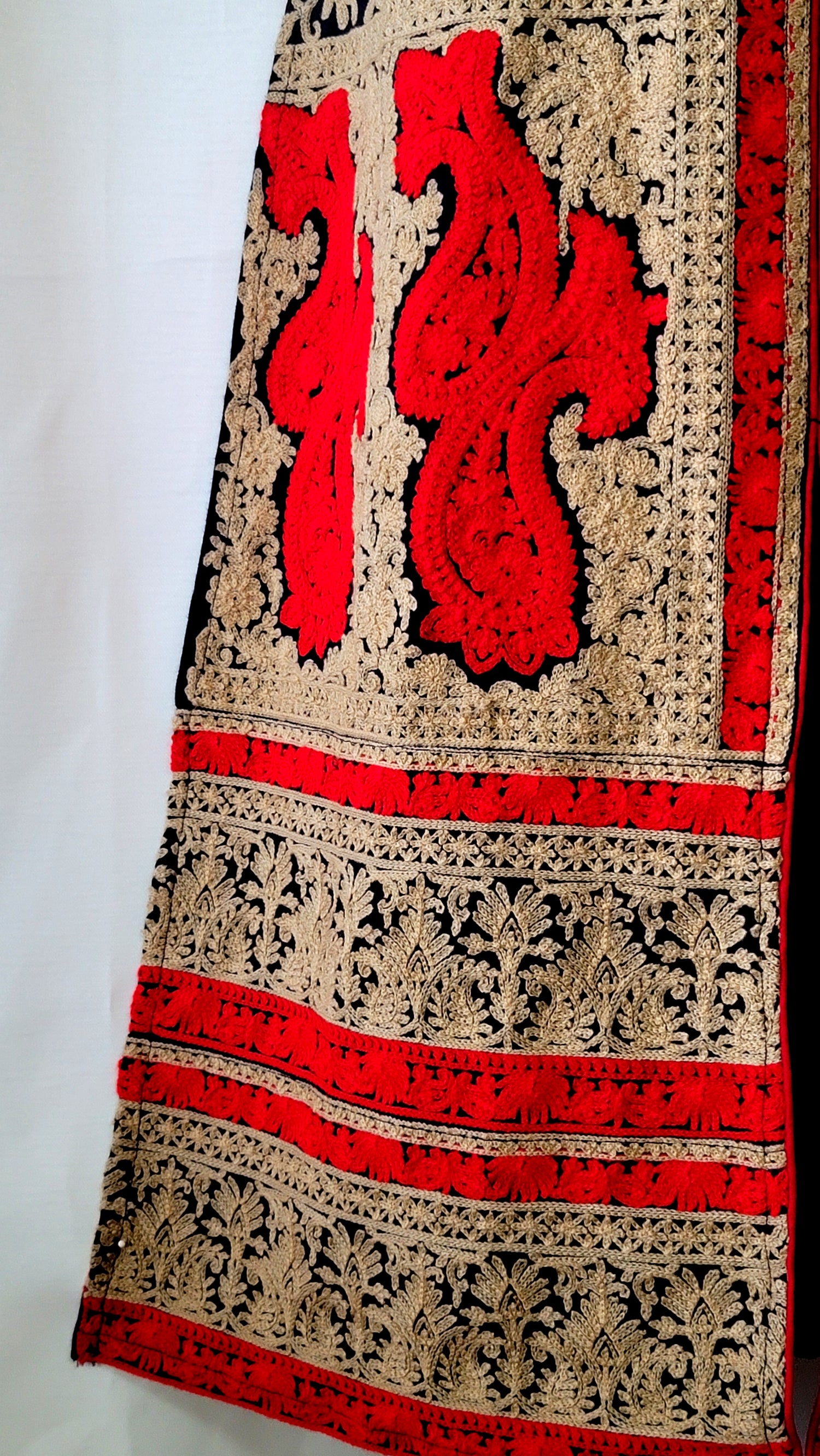 - Heavy paisley embroidery with yarn fibers