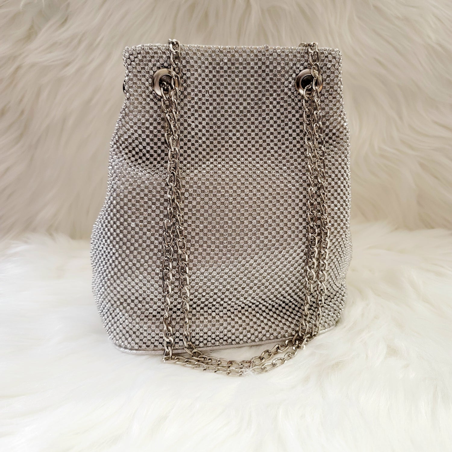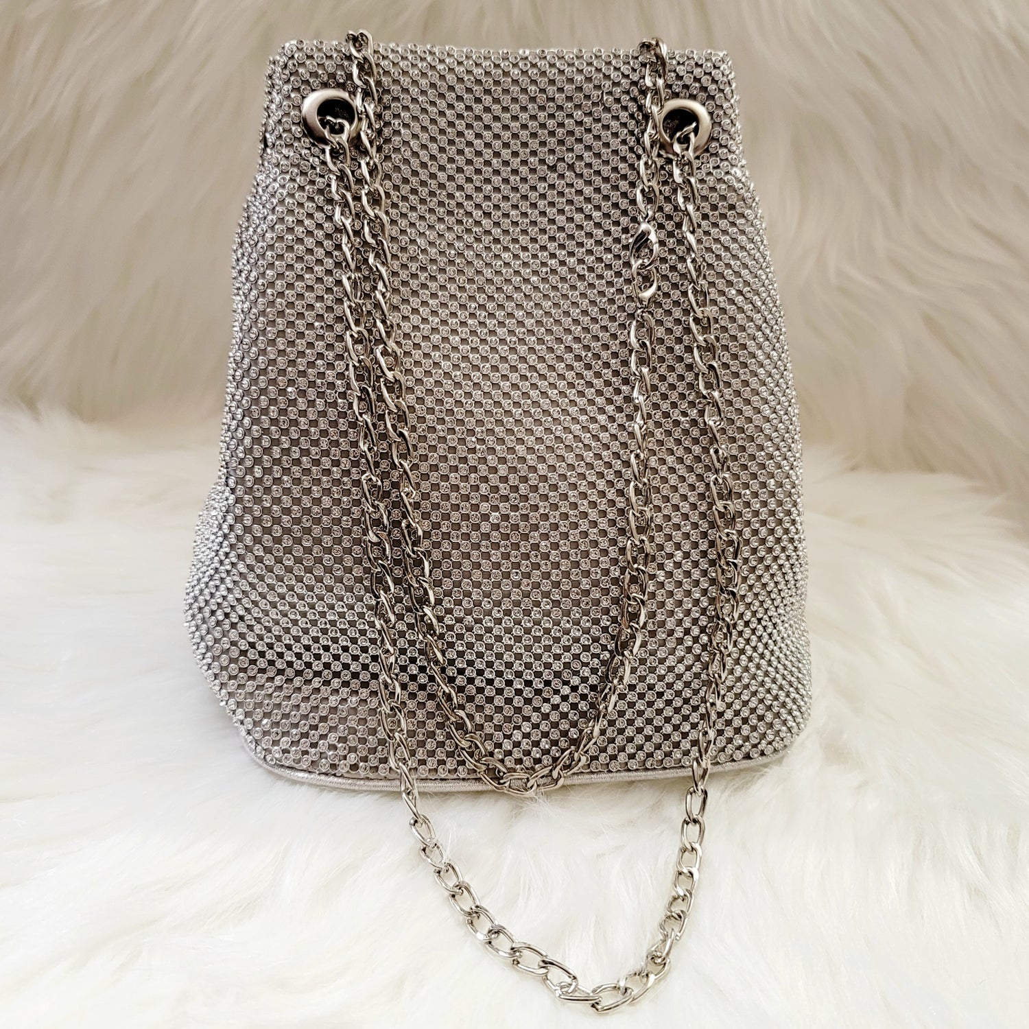 - A meticulously studded silver diamond mesh bucket bag that will turn heads whenever you take this with you.