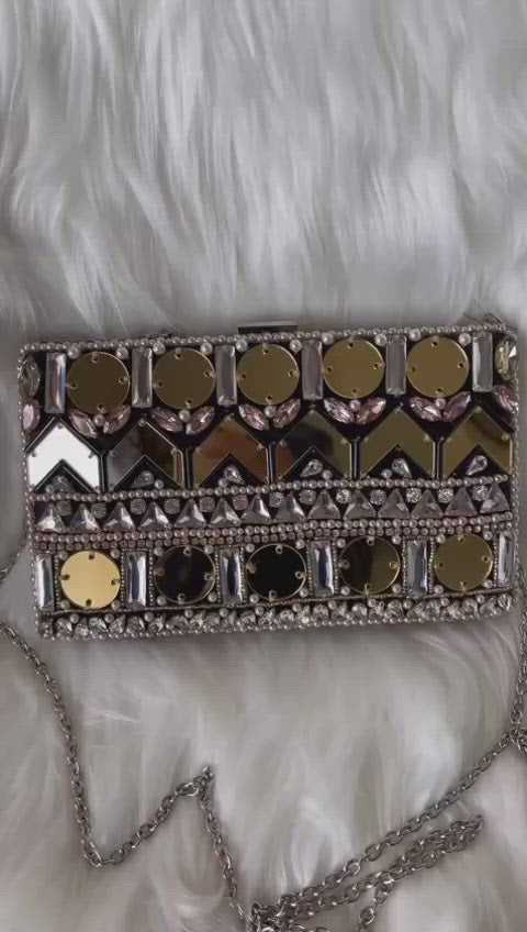 Beautiful golden glittery mirror and diamond embellished purse with long chain available for beautiful occassions like wedding, parties etc