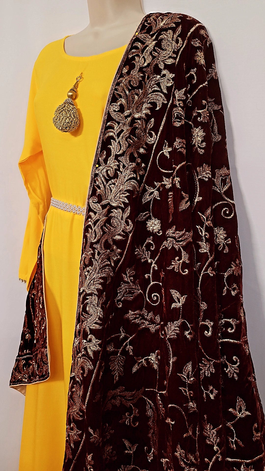 - A beautiful maroon velvet shawl with heavy floral gold zardosi embroidery.
