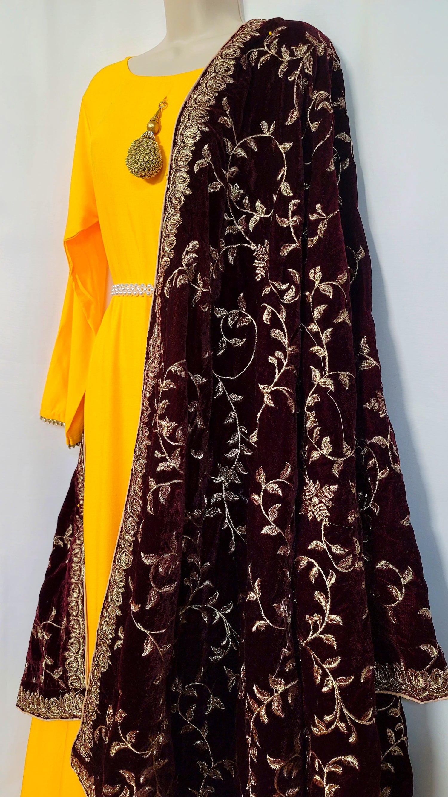 - A beautiful maroon velvet shawl with heavy gold zardosi embroidery of leaves.
